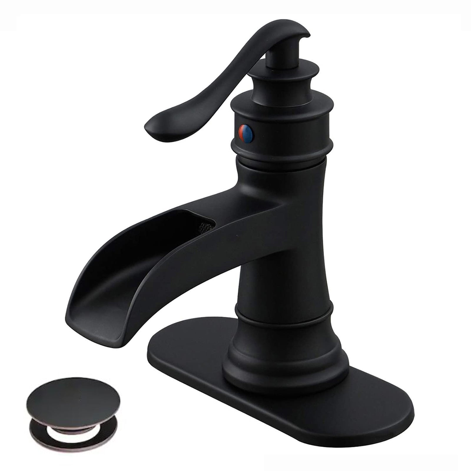 Waterfall Single Handle Single Hole Bathroom Sink Faucet with Pop-Up Drain Assembly Kit and Deckplate Included in Black